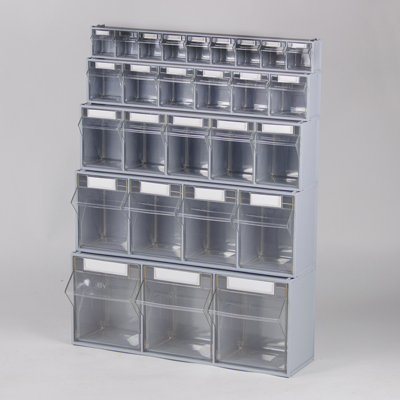 Les bacs basculants sont transparents pour permettre l’identification rapide du contenu. Grâce à des accessoires, tels que des armoires, des chariots et des rails muraux, ils peuvent facilement être empilés jusqu’à deux mètres de hauteur. Leur contenance varie de 0.3 à 20 litres. Souvent utilisés en pharmacie et dans les magasins de bricolage, nos gammes de bacs "Flexbin", "Mini-Multistore" et "Multistore" vous offrent une très grande modularité.