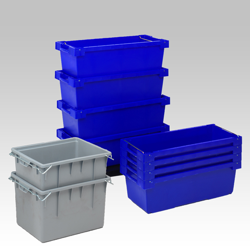 Caisses gerbables/emboîtables no-nonsense, souvent utilisés pour déménager les ordinateurs et les écrans. Pratiquement indestructibles, ils constituent une garantie pour le transport en toute sécurité des contenus de valeur. Gain d'espace de 50 % quand vide.