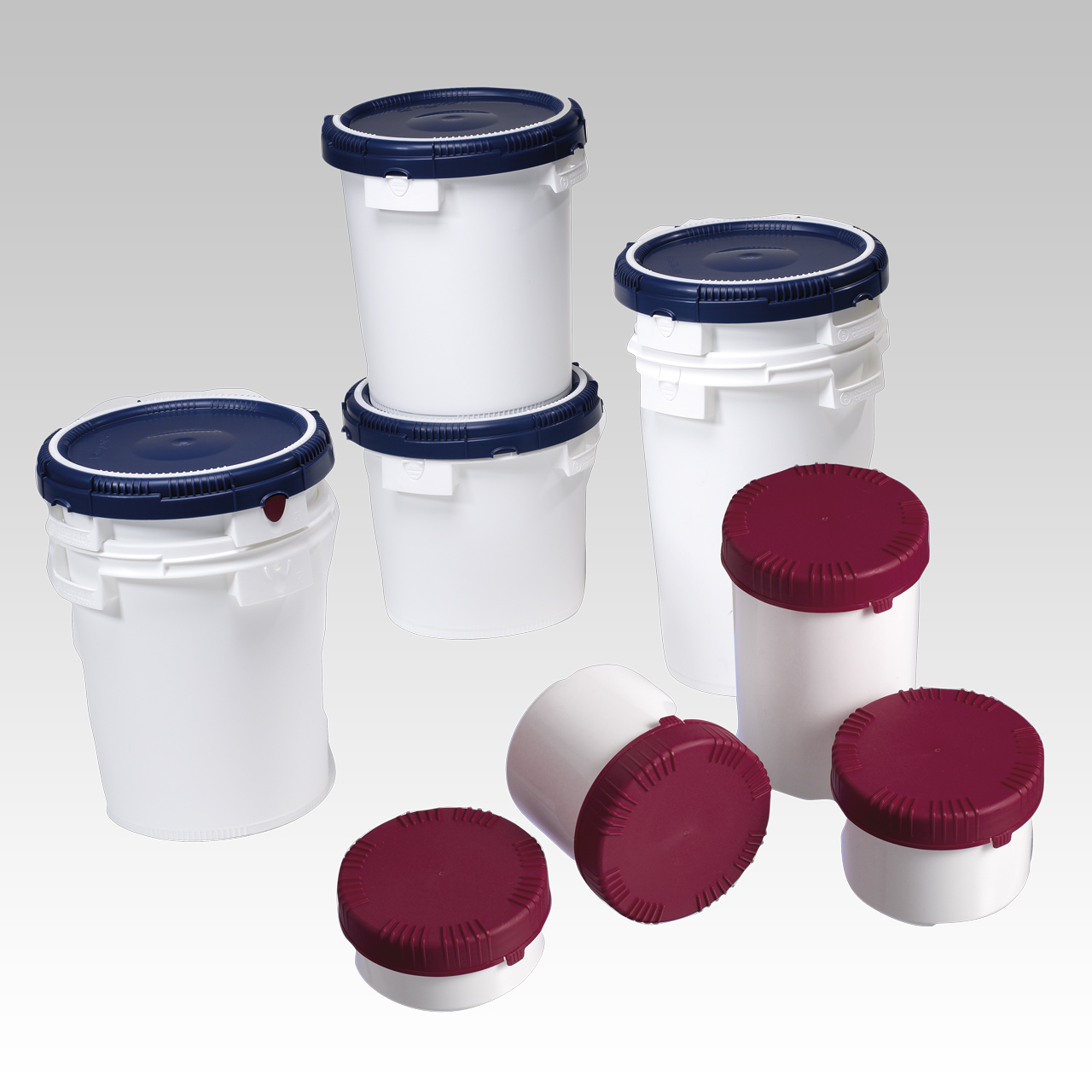 Pots, seaux, barils et fûts en plastique avec couvercle ; pour des produits pharmaceutiques, chimiques et alimentaires fabriqués de polyéthylène haute densité (PE-HD) ; étanche avec une faible transmission d’humidité ; emballage homologué ONU (1H2) pour les matières dangereuses solides et pâteuses.