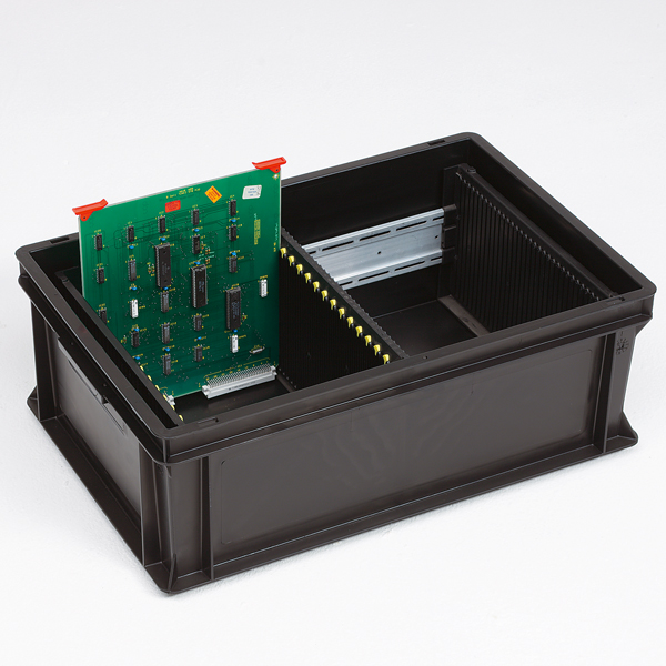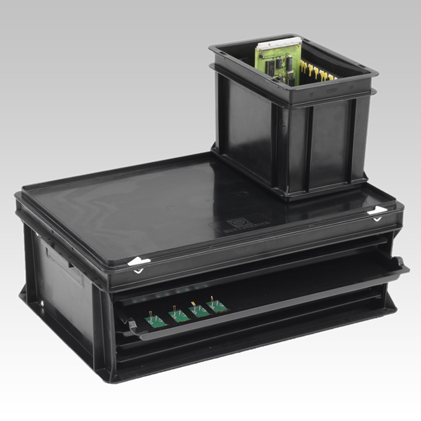 Tous les bacs et valises ESD (electrostatic discharge) protègent les modules électroniques des décharges électrostatiques. Les produits en matière plastique répondent à la norme VDA 4504 et s'inspirent de la norme EN 61340. Leur résistance est telle que l'électricité est évacuée progressivement, de sorte que le contenu ne soit jamais confronté à des ampérages dévastateurs. Ces produits sont déjà disponibles à partir de plusieurs centaines de pièces, et sont pourvus d'additifs qui protègent le contenu contre l'électricité statique.
