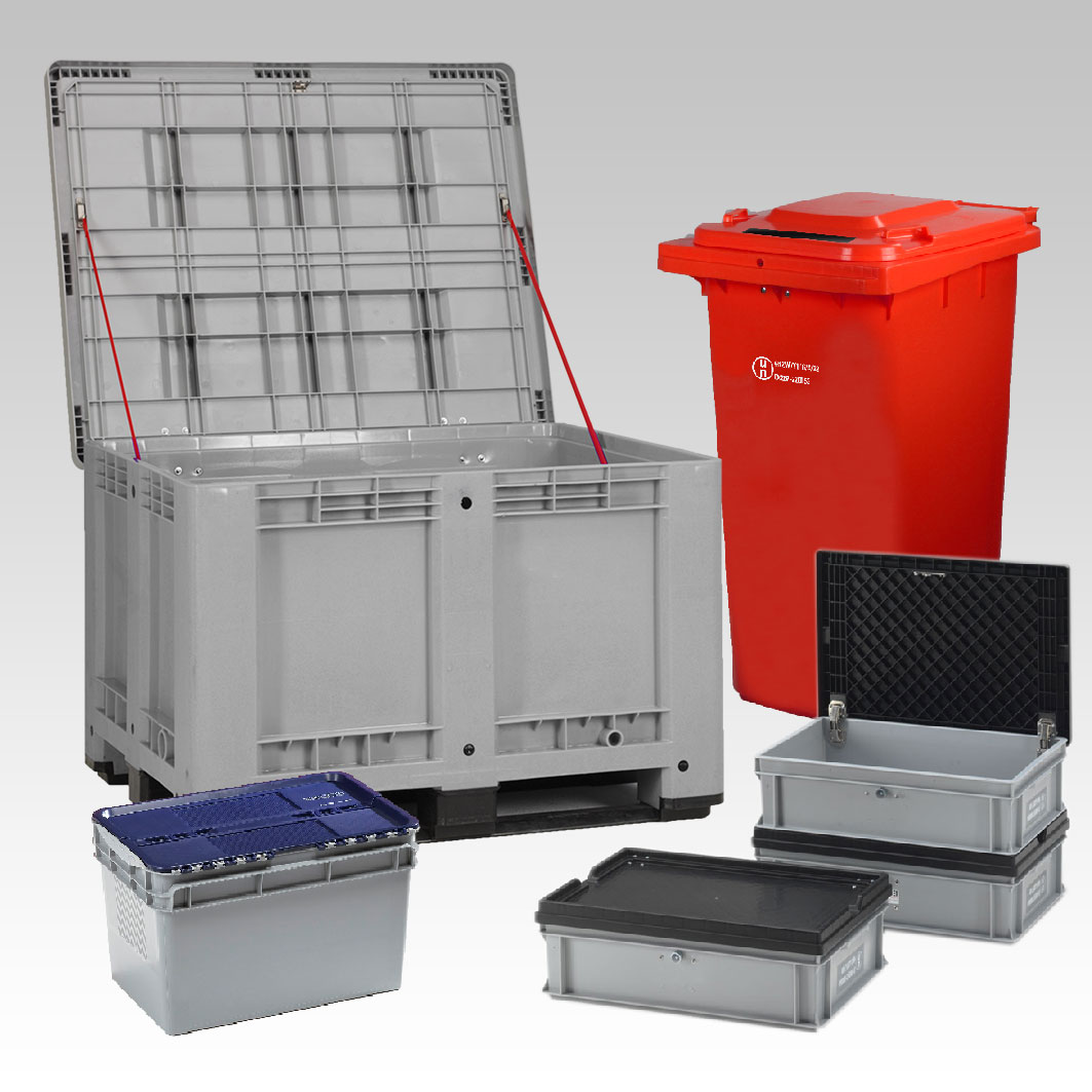 Conteneurs en plastique ou en métal pour la collecte en porte-à-porte des déchets bio, déchets spéciaux et déchets ménagers ainsi que pour la collecte du verre, du papier, d’emballages etc.