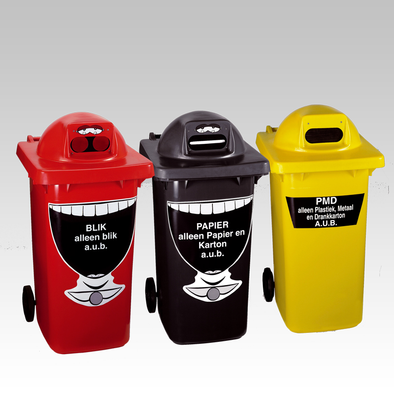 - Conteneurs poubelles avec opercules pour le tri : fente pour le papier, rosette pour le verre, presse-cannettes